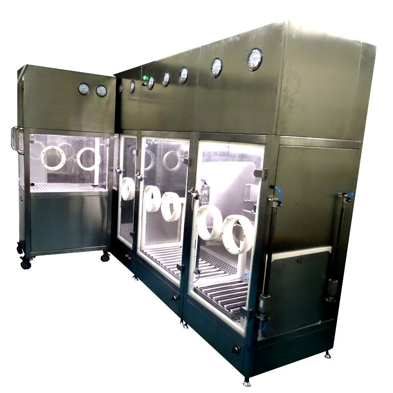 ·操作門采用10mm鋼化玻璃鉸鏈安裝 、隔離門采用費(fèi)斯托無桿氣缸提升門自動(dòng)控制,保證每個(gè)區(qū)對(duì)外和各區(qū)之間均保持10-15Pa壓差,采用美 國 諾斯or Piercan海普龍手套,防止污染和確保藥粉操作環(huán)境。系統(tǒng)配套本公司DM200A6手套在線全自動(dòng)測(cè)漏儀進(jìn)行安全檢漏測(cè)試